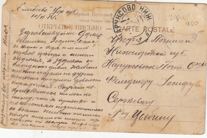 Куда: г. Починки, Нижегородской губ. Наруксовское почт. отдел