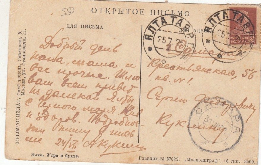 Добрый день папа, мама и все прочие. Шлю вам всем привет из далекой Ялты с Черного моря. Жив и здоров. Подробности пишу в письме 24/VII АКукин