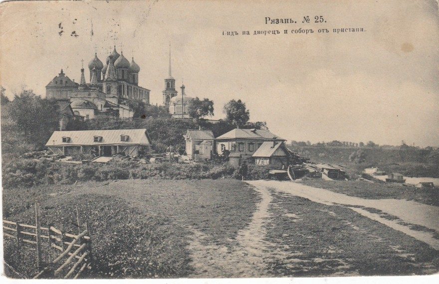 Описание картинки: Рязань. № 25. Вид на дворец и собор от пристани.