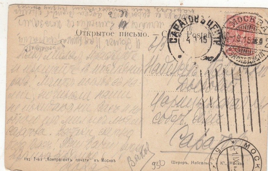 Надя милая здраствуете [^здравствуйте] и прощайте в последний раз! Мчится [нрзб] с нами, но мысли наши не покидают ни Вас и ни одного из милых людей Саратова. Всетаки [^все таки] скучно без Вас! Жму Вашу ручку крепко крепко Варя {И [?Эрме] Наденька, скучают, [нрзб] мчится; [влиж…] исчезли, никак не спрыгнуть адски быстро [?прет] паровоз. [нрзб] Ваш [нрзб] [?Эрме]}
