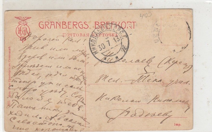 Куда: Николаев (Херс[онская] губ[ерния]) Жел[езнодорожное] Техн[ическое] учил[ище]
