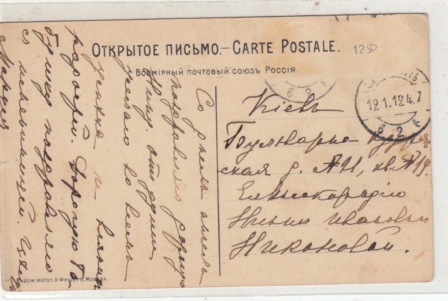Куда: Киев Бульварно-Кудрявская д[ом] № 21 кв. № 19.