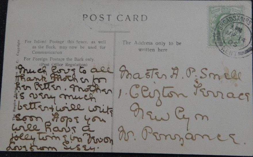 Much love to all. Thank Mother for her letter. Mother is very much better will write soon. Hope you will have a jolly time in Devon. Love from Sissy