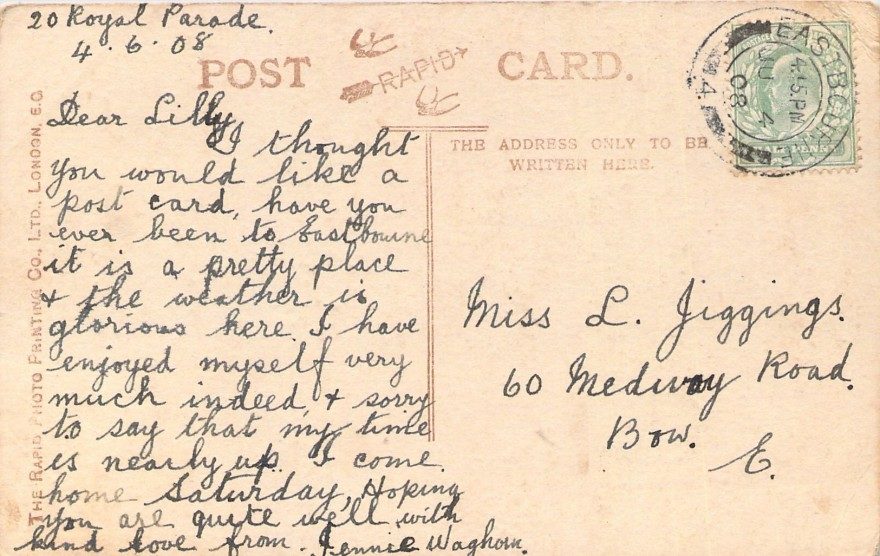 I thought you would like a postcard, have you ever been to Eastbourne it is a pretty place & the weather is glorious here. I have enjoyed myself very much indeed, & sorry to say that me time is nearly up. I come home Saturday. Hoping you are quite well. With kind love from Jennie Waghorn