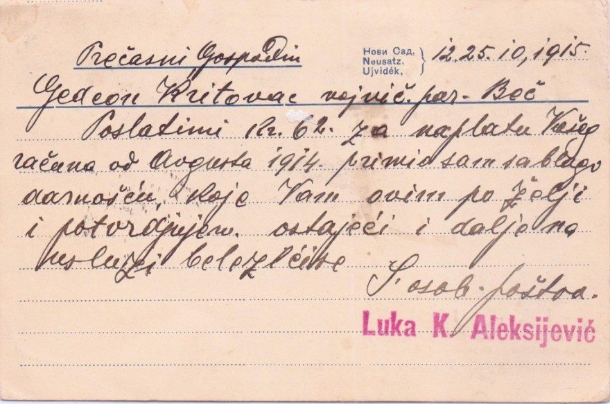 Многоуважаемый господин 12.25 10 1915. Гедеон Критовац воен. [нрзб] Вена. Присланные документы для оплаты Вашего счета за август 1914 года я принял с благодарностью, что подтверждаю всем вам по Вашей просьбе. И далее остаюсь к Вашим услугам. С особым уважением. Лука К. Аексиевич