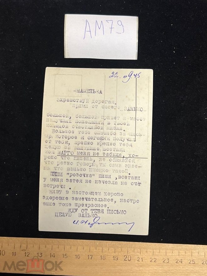 {22.09.45} МАШЕНЬКА Здравствуй дорогая, прими от своего ..ВАНЬКО.. большой, большой привет и массу наилучших пожеланий в твоей молодой счастливой жизни. Большое тебе спасибо за письмо, которое я сегодня получил от тебя, крепко крепко тебя целую за внимание, все таки моя МАРГО меня не забыла, хорошо что пишешь, не обижайся что резко говорю, ты сама знаешь что Ванько именно такой. ПИШИ "розочка" пиши, всетаки [^все-таки] у меня затея не изчезла [^исчезла] на счет [^насчет] встречи. живу в настоящем хорошо здоровие замечательное, настроение тоже прекрасное. ЖДУ ОТ ТЕБЯ ПИСЬМО, ЦЕЛУЮ ВАНЬКО