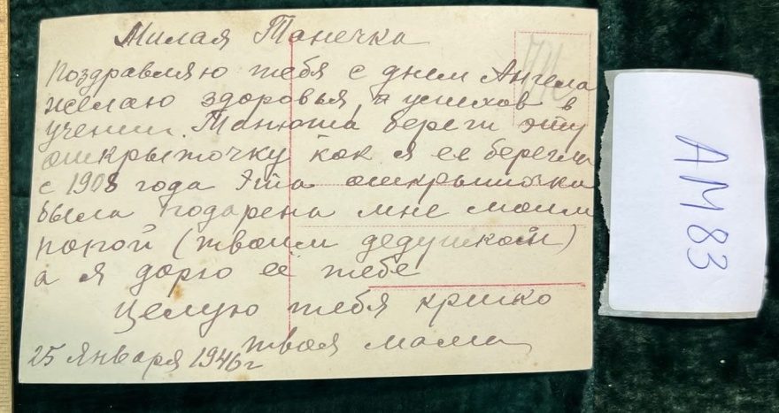 Милая Танечка Поздравляю тебя с днем Ангела. Желаю здоровья, и успехов в учении. Танюша береги эту открыточку как я ее берегла с 1908 года Эта открыточка была подарена мне моим папой (твоим дедушкой) а я дорю [^дарю] ее тебе. Целую тебя крепко твоя мама 25 января 1946 г[од]