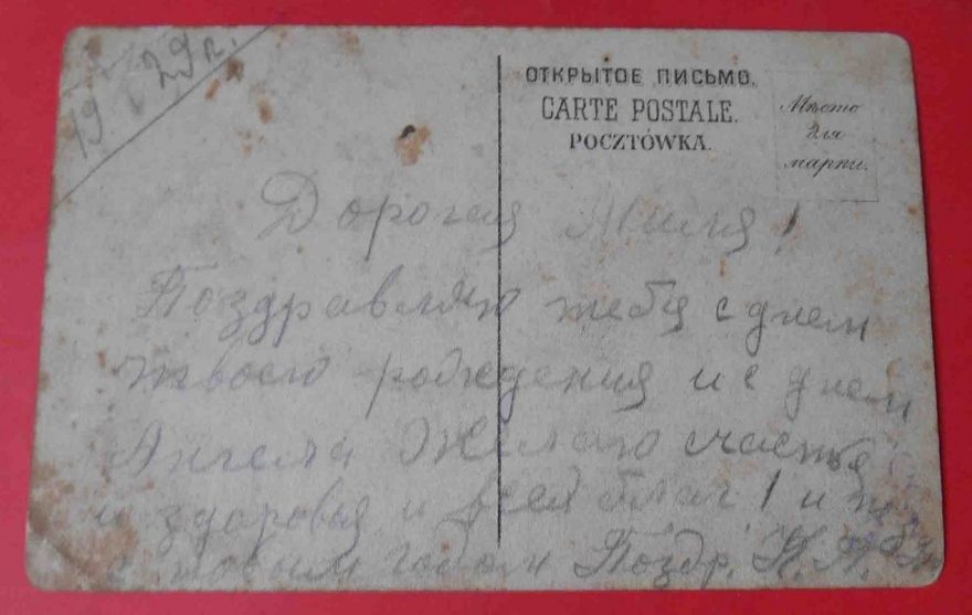 Дорогая Миля! Поздравляю тебя с днем твоего рождения и с днем Ангела. Желаю счастья и здоровья и всех благ! и поздр[авляю] с новым годом. Поздр.[авляю] К. А.