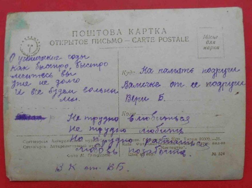 О ученические годы как быстро, быстро мчитесь вы уже не долго И все будем вольны мы. Не трудно влюбиться Не трудно любить Но трудно расстаться любовь позабыть. В К от В Б. {На память подруги[^подруге] Валичке от ее подруги Вери[^Веры] Б.}