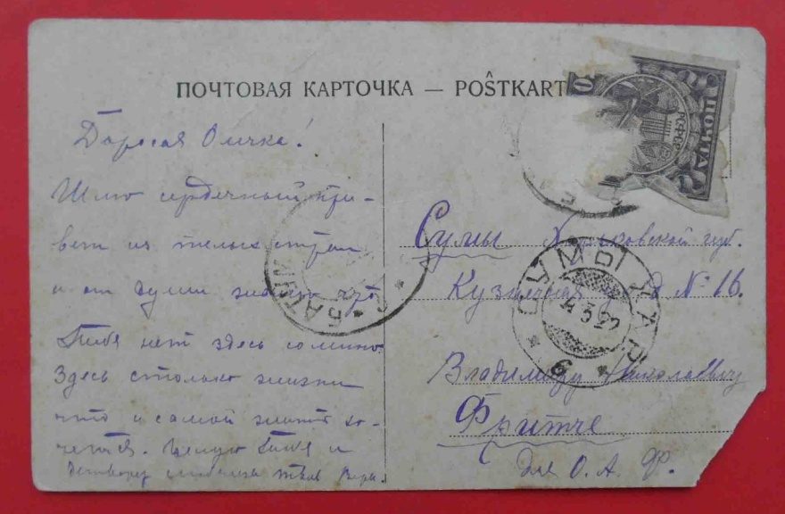 Дорогая Олечка! Шлю сердечный привет из теплой страны и от души жалею что тебя нет здесь со мною. Здесь столько жизни что и самой жить хочется. Целую тебя и [нрзб] сильно. Твоя Вера.