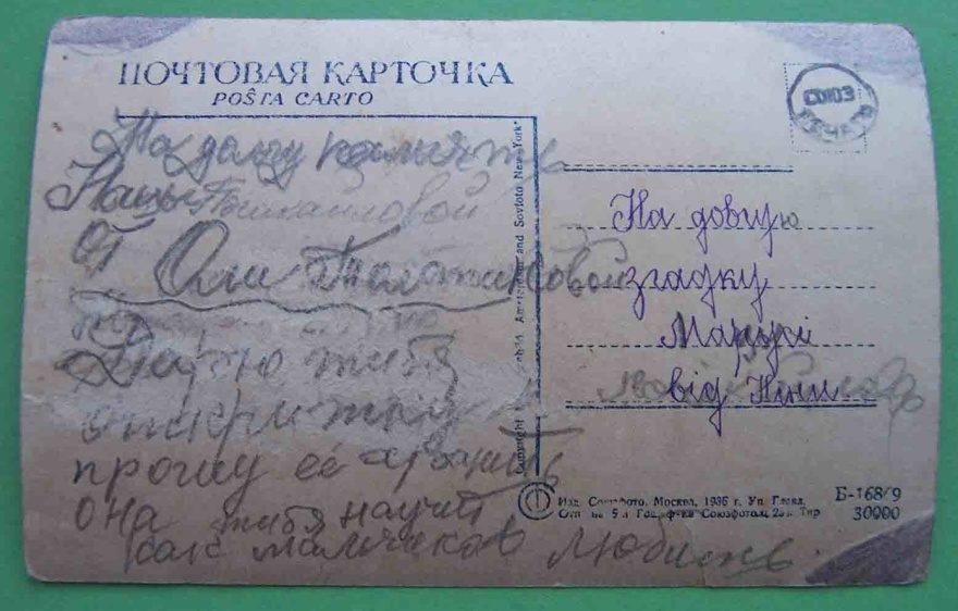 На долгу память Наны [?Пхикаиловой] от Оли [?Талатиновой] Дарю тебе открытку, прошу ее хранить. Она тебя научит как мальчиков любить. На довную згадку Маруси вiд Нiни