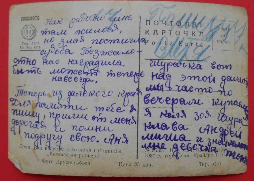 Как радостно мне там жилося, но злая постигла судьба Безжалостно нас наградила быть может теперь навсегда. Теперь из далёкого края Для памяти тебе я пишу, прими от меня дорогая и помни подругу свою. Аня {Шурочка вот над этой дамой мы часто по вечерам купаемся Я Коля Зоя Шура Клава Андрей Миша и знакомая мне девочка Тоня}