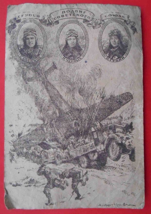 Описание картинки: Рис[унок] худ[ожника] А. Н. Яр-Кравченко. Экипаж комсомольцев - И. Черных, С. Косинов и Н. Губин вылетел громить вражеские резервы. Немецкие зенитки подожгли их самолет. Оставался один выход 0 прыгать с парашютом. Но внизу были немцы. Три комсомольца предпочли умереть, чем сдаться в плен. Переведя горящий самолет в пике, герои врезались на нем в самую гущу моторизованной колонны врага, похоронив под обломками самолета большое количество фашистов.