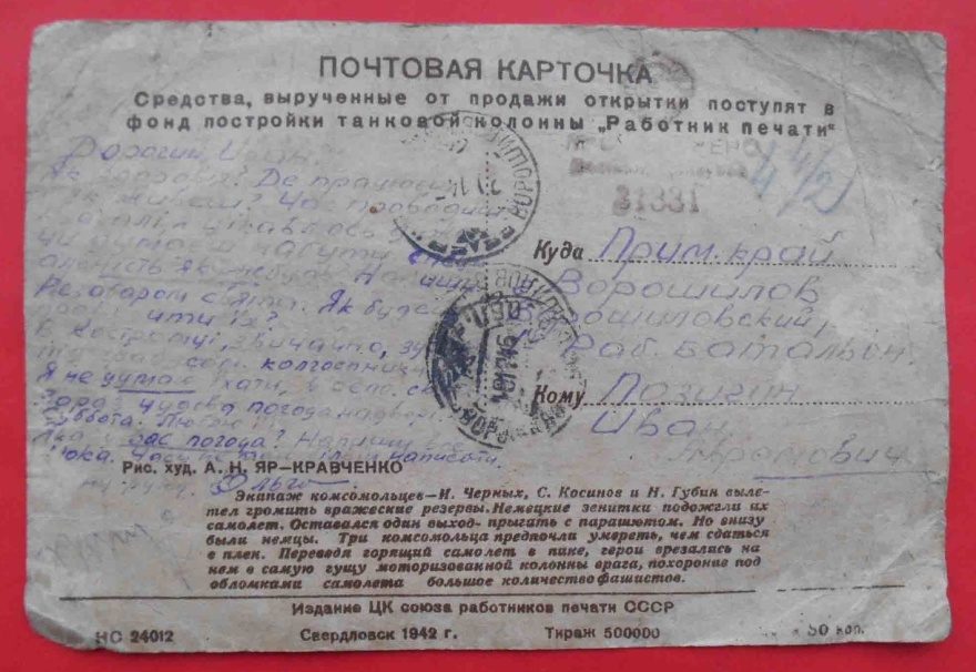 Описание открытки: Издание ЦК союза работников печати СССР. НО 24012, Свердловск 1942 г., Тираж 500000 50 коп.