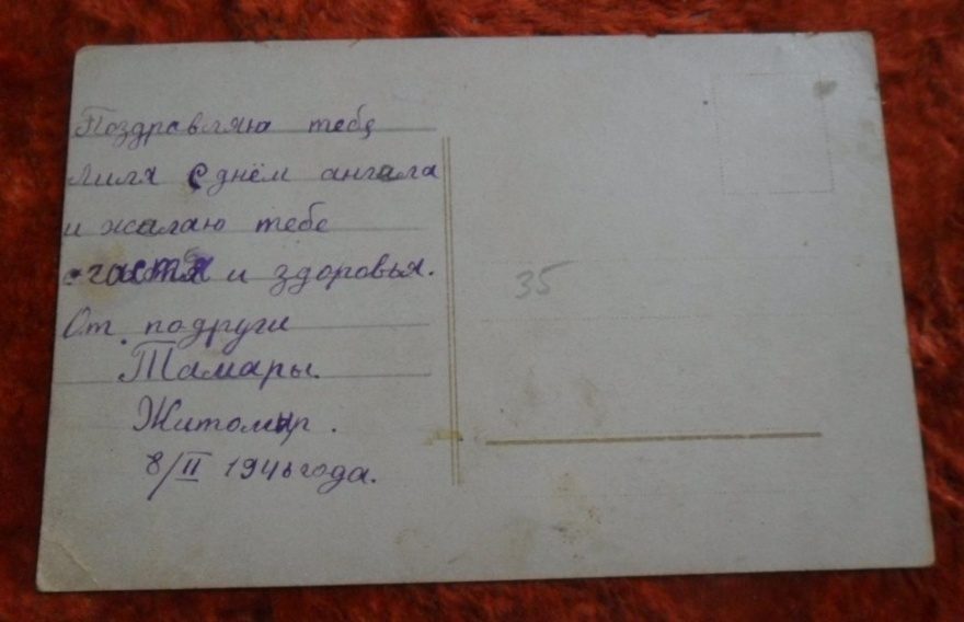 Поздравляю тебя Лиля С днем ангела и желаю тебе счастья и здоровья. От подруги Тамары. Житомир. 8/II 1946 года