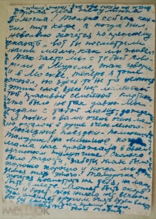 Дорогая моя женушка Томочка! Только сейчас кончил пить кофе, а когда пил, невольно хочется по прежнему сказать "вот бы посмотрели наши мамы, как мы живем" так часто мы с тобой говорили в Муроме, так говорили и в Москве, теперь я тоже сказал, но здесь-то не та ценность этих слов, здесь нет маленькой той красивой семейной картинки что было не так давно. Мы ждали с тобой маму, - дождались. Я побыл с вами очень очень мало, но осталось в душе очень много - последние поездки - помнишь Тамурик! на машине, когда мама нас провожала в своем овчинном тулупчике? Сколько было радости, заботы, так было хорошо хорошо и когда мы дождемся опять этого? Тамурочка! хочется посмотреть на тебя, на маму, быть вместе. Может быть скоро это и будет. Ведь ничего нет вечного. одно сменяет другим. Опять будем вместе все все вместе. Всех крепко целую. [нрзб] 1943 твой Вовка. {ни одного письма еще нет} {Вам привет} {Письм ни откого еще нет. Пишите скорее}