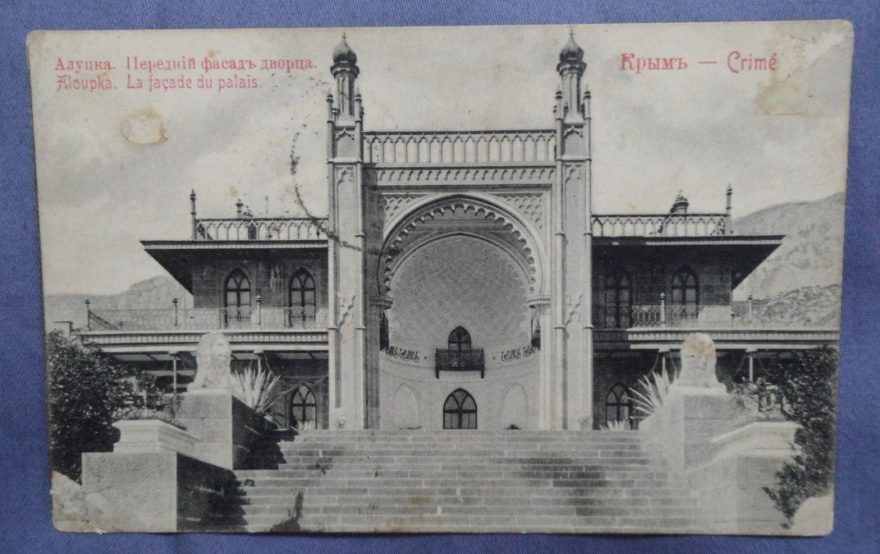 Описание картинки: Алупка. Передний фасад дворца. Aloupka. La facade du palais. Крым - Crime