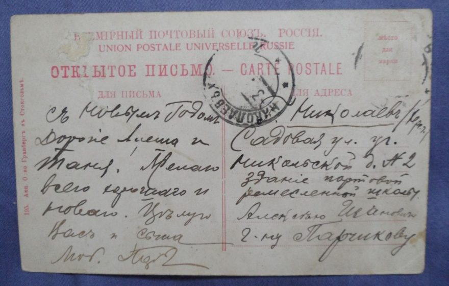 Куда: Г. Николаев (Херс[онская] г[уберния]) Садовая ул. уг[ол] Никольской д. №2 здание портовой ремесленной школы