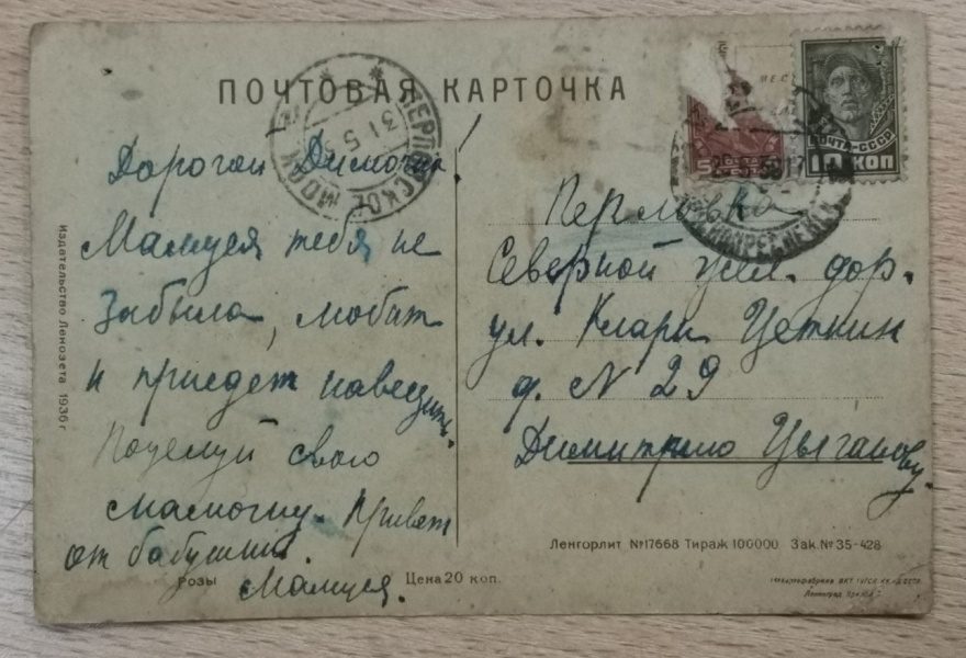 Дорогой Димочка! Мамуся тебя не забыла, любит и приедет навестить. Поцелуй свою мамочку. Привет от бабушки. Мамуся.
