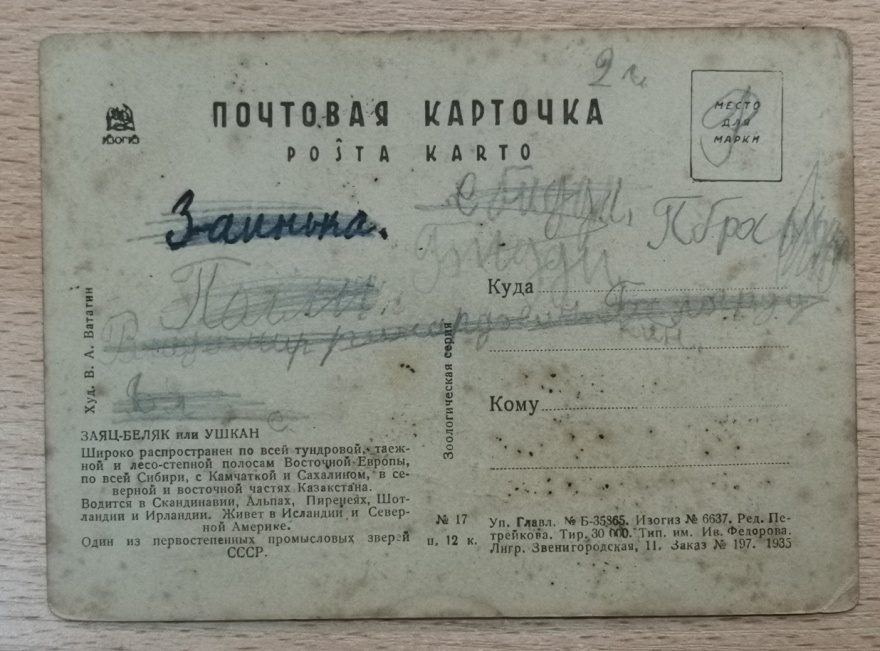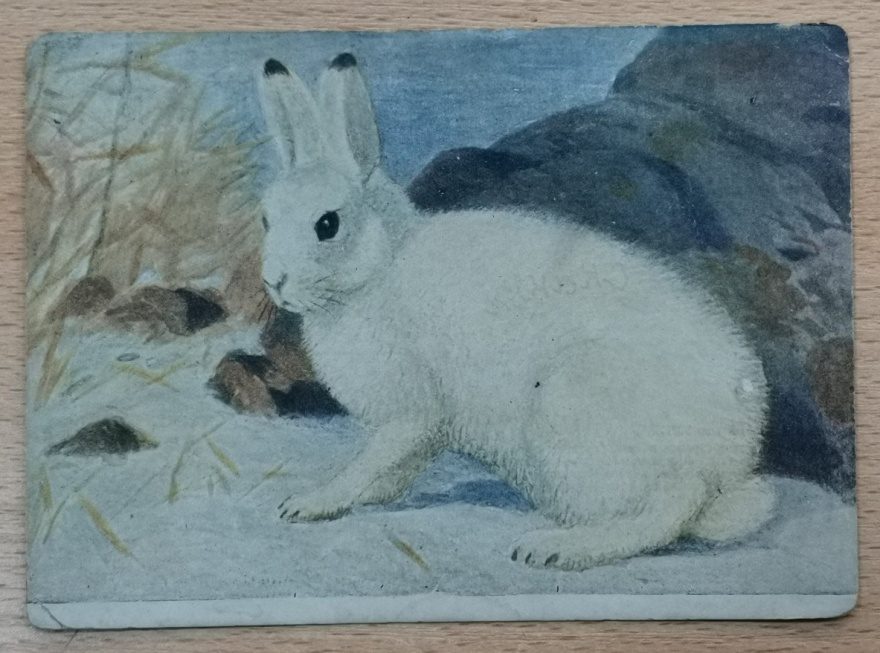 Описание картинки: ЗАЯЦ-БЕЛЯК или УШКАН. Широко распространен по всей тундровой, таежной и лесо-степной полосам Восточной Европы, по всей Сибири, с Камчаткой и Сахалином, в северной и восточной частях Казахстана. Водится в Скандинавии, Альпах, Пиренеях, Шотландии и Ирландии. Живет в Исландии и Северной Америке. Один из первостепенных промысловых зверей. CCCP. Худ. В.А. Ватагин
