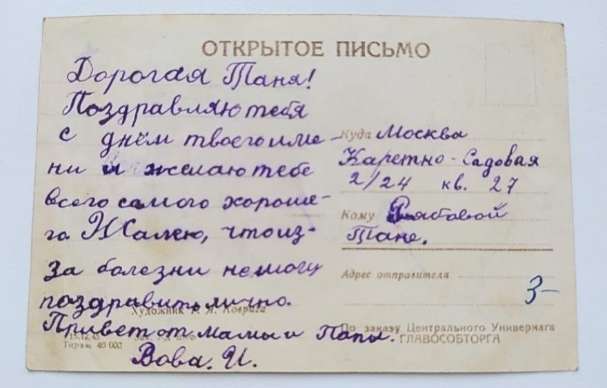 Дорогая Таня! Поздравляю тебя с днем твоего имени и желаю тебе всего самого хорошего Жалею, что из за болезни не могу[^не могу] поздравить лично. Привет от Мамы и Папы. Вова. И.