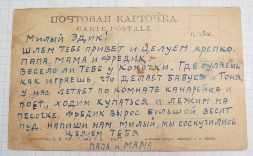 Милый Эдик! Шлем тебе привет и целуем крепко. Папа, мама и Фредик. Весело ли тебе у Кокочки. Где гуляешь, как играешь, что делает бабуся и Тоня. У нас летает по комнате канарейка и поет, ходим купаться и лежим на песочке. Фредик вырос большой, весит пуд. Напиши нам, милый, мы соскучились. Целуем тебя. Папа и мама.