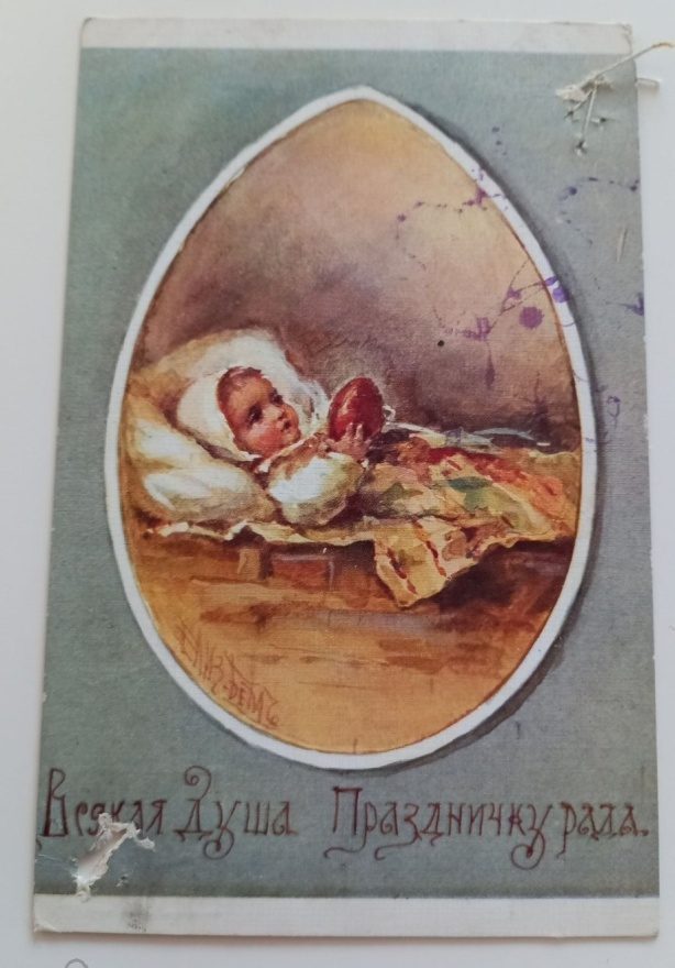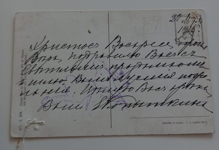 Христос Воскресе дорогие [нрзб] поздравляю всех со святым праздником и шлю вам лучшие пожелания. Целую всех крепко. Ваш Копытпин