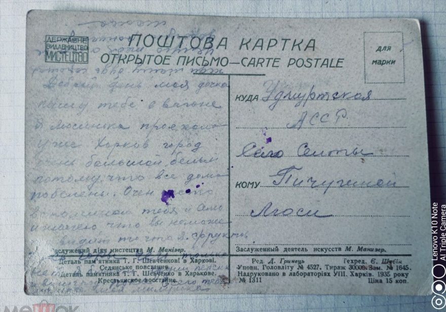 Описание открытки: Уповн. Головлiту №4527. Тираж 30000. Зам. № 1645. Надруковано в лабораторiях УПI. Харькiв. 1935 року №1311. Цiна 15 коп.
