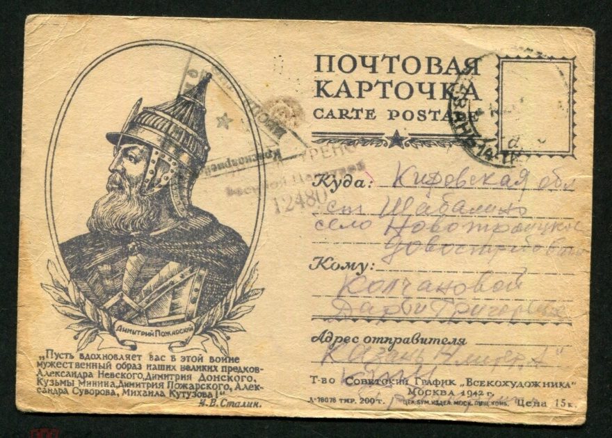 Описание открытки: Т-во Советский График "Всекохудожника" Москва 1942 г. Л-76078 тир. 200т. цех. бум. издел. моск. пищ. комб. Цена 15 к.