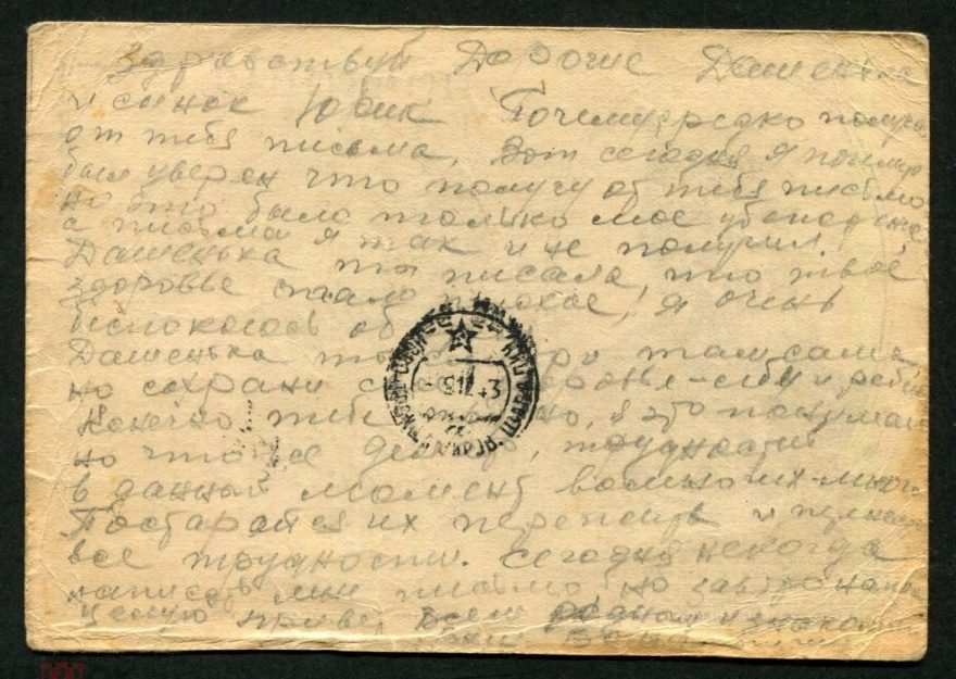 Здравствуй Дорогие Дашенька и сынок Юрик. Почему редко получаю от тебя письма, Вот сегодня я почему-то был уверен что получу от тебя письмо но это было только мое убеждение а письмо я так и не получил. Дашенька ты писала, что твое здоровье стало плохое, я очень беспокоюсь об [нрзб]. Дашенька ты смотри там сама но сохрани свое здоровье - себя и ребенка Конечно тебе трудно, я это подумал но что все же делать, трудности в данный момент во многих-многих. Постарайся их пережить и [п...] все трудности. сегодня некогда написать мне письмо, но завтра напишу целую привет всем родным и знакомым [нрзб]