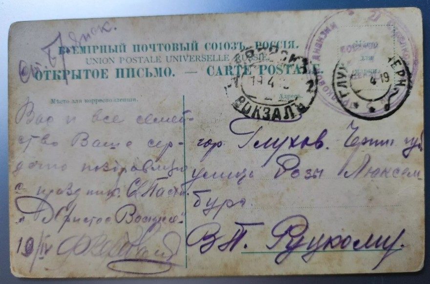 Куда: гор[од] Глухов Черниг[овская] губ[ерния] улица Розы Люксембург