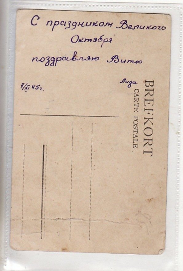 С праздником Великого Октября поздравляю Витю 7/XI 45 г. Лида.