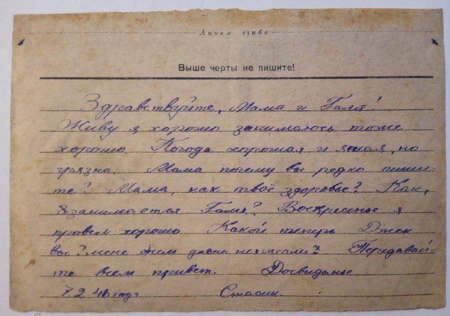 Здравствуйте, Мама и Галя! Живу я хорошо занимаюсь тоже хорошо. Погода хорошая и ясная, но грязно. Мама почему вы редко пишите [^пишете]? Мама, как твое здоровье? Как, занимается Галя? Воскресенье я провел хорошо. Какой теперь Джек вы? мене [^мне] писем давно не писали. Передавайте всем привет. Досвидание [^До свидания]. {7.2.46 года. Стасик}