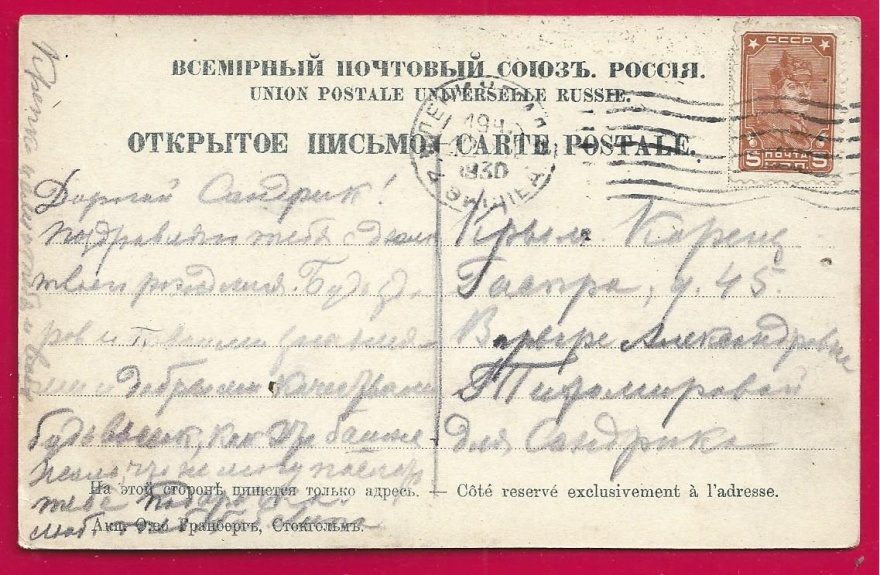 Дата отправления, штамп: 1930