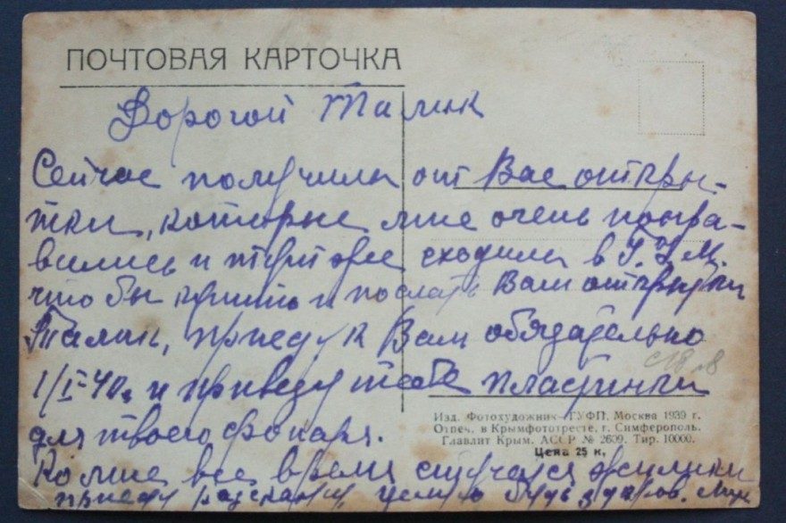 Описание открытки: Изд. Фотохудожник - ГУФП. Москва 1939 г. Отпеч. в Крымфототресте г. Симферополь. Главлит Крым. АССР № 2609. Тир. 10000. Цена 25 к.