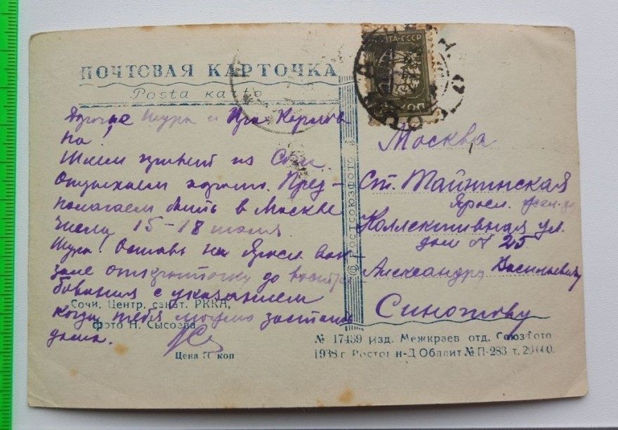 Шлем привет из Сочи. Отдыхаем хорошо. Предполагаем быть в Москве числа 15-18 июня. Шура! Оставь на Яросл[авском] вокзале открытку до востребования с указанием когда тебя можно застать дома.