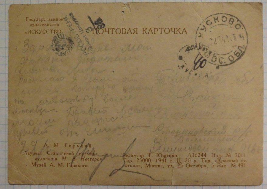 Описание открытки: Государственное издательство "Искусство". Редактор Т. Ющенко. A36244. Изд. № 7011. Тир. 25000. 1941 г. Ц. 20 к. Тип. «Красный печатник», Москва, ул, 25 Октября, 5. Зак № 491.