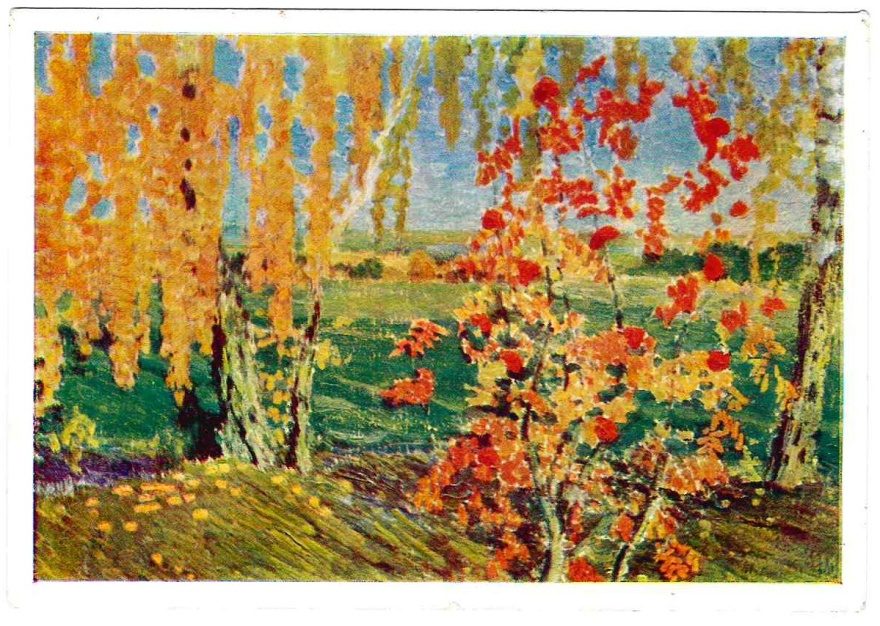 Описание открытки: И. Э. Грабарь (1871-1960) Рябинка. 1915 г. Государственная Третьяковская галерея А08907-63 г. 9-1634. Т. 90 000. З. 2623. Ц. 3 коп. Московская типография № 2 Мосгорсовнархова