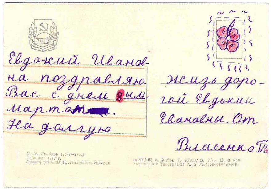 Евдакий[^Евдакия] Ивановна поздравляю Вас с днем 8ым мартом[^марта]. На долгую жиз[н]ь дорогой Евдокии Ивановны. От Власенко Т.