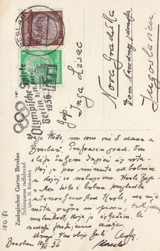 Draga Kosta, mi smo već 8 dana u Breslau. Prekrasan grad. Ovu sliku šaljem Ingici iz vrta - koj [^koji] je par minuta od bolnice u kojoj se nalazimo. Hvala Bogu nakon teške i bolne pregledbe ustanovljeno kod Karla , da nije ništa važna ni opasna, tak jedna malenkost, koja je izlječiva. U nedelju putujemo dalje. Mnogo Vas oboje ljubi