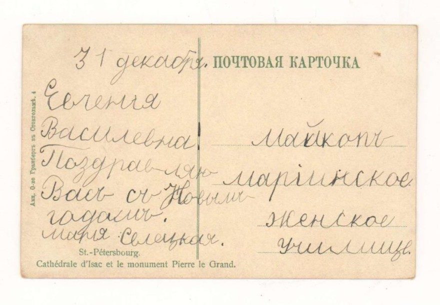 {31 декабря.} Евгения Васильевна! поздравляю Вас с Новым годам[^годом]. Мария Селецкая.