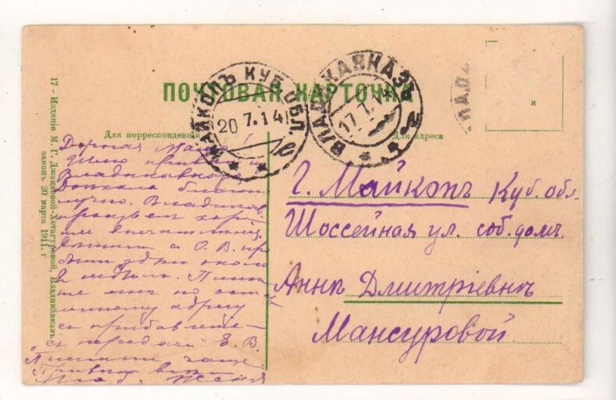 Дорогая Мама! Шлю привет из Владикавказа. Доехала благополучно. Владикав[каз] произвел хорошее впечатление. [нрзб] и О. В. пробыли здесь около 2 недель. Пишите мне по оставленному адресу с прибавлением "с [? передачей] Е. В. Пишите чаще. Привет вам. Люб[лю], Таня