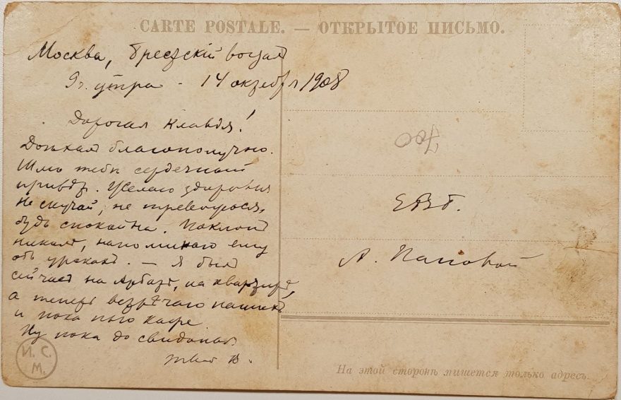 {Москва, брестский вокзал 9ч. утра - 14 октября 1908} Дорогая Клавдия! Доехал благополучно. Шлю тебе сердечный привет. Желаю здоровья не скучай, не тревожься, будь спокойна. Поклон Никите, напоминаю ему об уроках. - Я был сейчас на Арбате, на квартире, а теперь встречаю наших и пока пью кофе