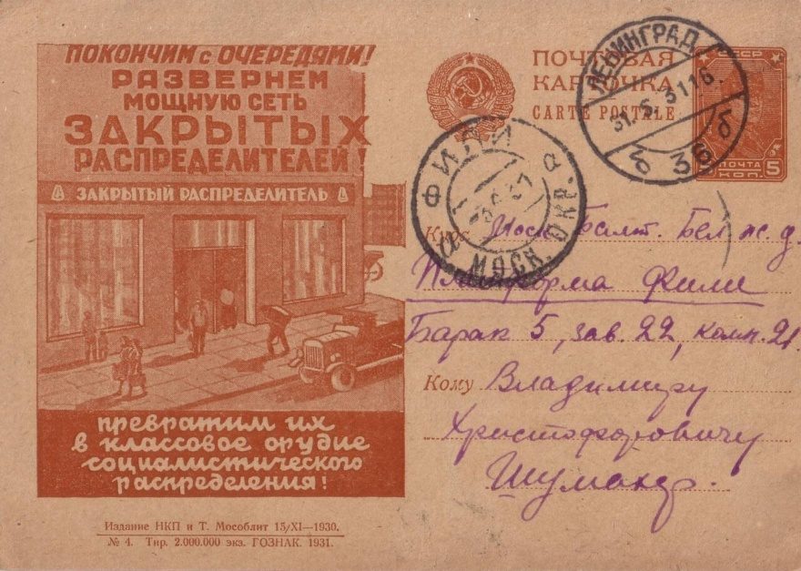 Описание открытки: Издание НКП и Т. Мособлит 15/XI-1930. №4. Тир. 2000000 экз. ГОЗНАК 1931.