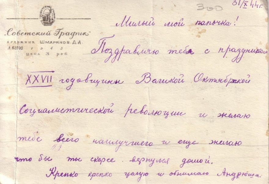 {31/X 44 г.} Милый мой папочка! Поздравляю тебя с праздником XXVII годовщины Великой Октябрьской Социалистической революции и желаю тебе всего наилучшего и еще желаю что бы [^чтобы] ты скорее вернулся домой. Крепко крепко целую и обнимаю Андрюша